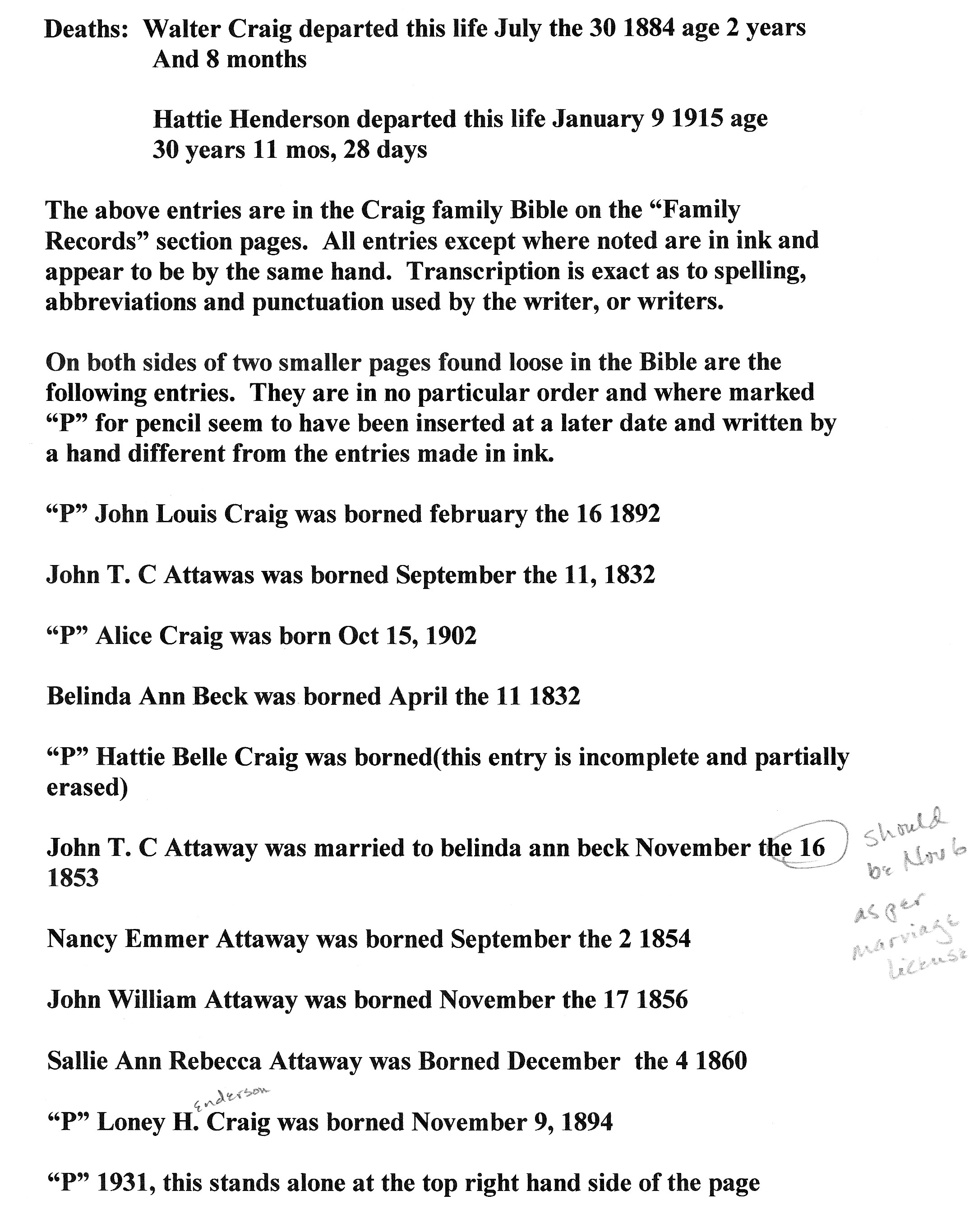 Family records recorded in the Craig Family Bible, generously provided by a Sallie Attaway Craig descendent, have been a great help to those of us researching the Attaway family. The following pages were transcribed from that Bible.