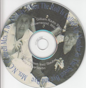 On May 1, 1952, Grandma Attaway (Matilda Virginia Northcott Attaway)and her sister, Aunt Nan (Nancy Catherine Northcott Cottrell) went into Gilliam’s Radio shop in Brownwood Texas. I don’t know who all went with them. The record label had been written mostly in pen, and other than the names of the songs, the date and establishment, it listed “Group: Sis. Gressett and Inez Stauber” and “Piano: Faye Martin”. Someone had penciled in “#3” on one side, and “#4” on the other. I believe it must have been my grandmother, Sallie Attaway Bingham, who wrote on it in ink “Mother and Aunt Sis.”
